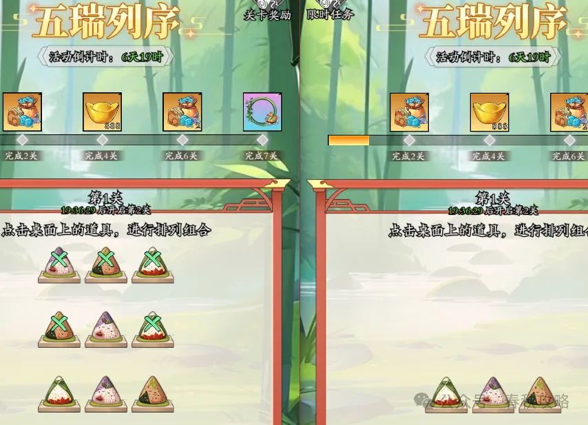 2、【五端列序】这个活动需要消耗端午方粽来进行排列,最少一关3个,目前是第一关,只有3个粽子,后续暂时不太清楚。端午方粽可以通过每日限时任务获取。