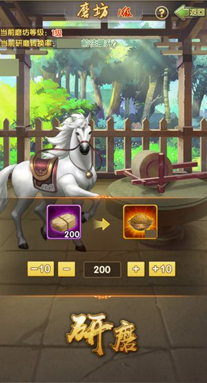 磨房是资源型建筑,掌门可在磨房中将草料研磨成饲料供养坐骑。升级磨房,可提高研磨的转换率,使得草料研磨成更多的饲料。铸币厂也是资源型建筑,掌门可在铸币厂中将镔铁铸造成相马币,在马市中使用。同样,升级铸币厂可提高铸造转换率,使得单位镔铁铸造成更多的相马币。