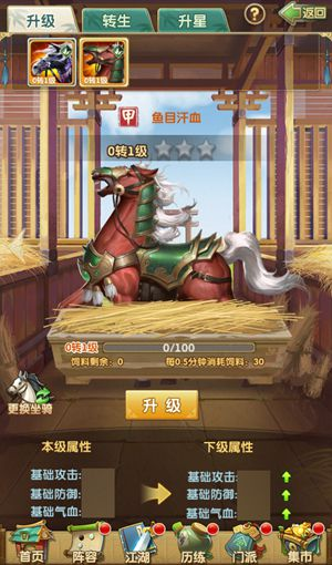 坐骑的升级是挂机式的玩法,只要饲料充足,养在马厩中的坐骑就会随时间得到经验。前面也提到了,当升级到一定级数,坐骑必须转生才可继续获得经验升级。而坐骑的转生,需要消耗同等级的坐骑作为材料。因此,当阵上的坐骑已经满级,需要转生的时候,掌门可以将马厩的位置用于升级材料马,这样才能最大化的提升坐骑的等级。