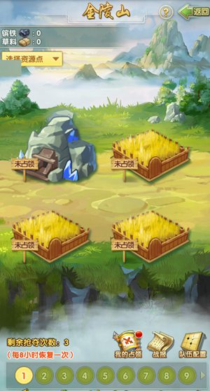 配合蓄马场的出现,金陵山的相关玩法也开启了。游戏中,掌门可在金陵山中通过占领资源点获取资源,而资源点分为铁矿场和草料场两种,铁矿场生产镔铁,草料场生产草料。需要注意的是,每个弟子最多只能占领两个资源点,抢夺和防守都会以队伍为单位进行,掌门需要合理分配队伍,一个队伍最多放置3名弟子。