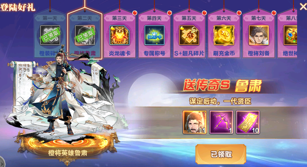 新服登录活动,登录2天送传奇s英雄鲁肃,登录7天送强力刘皇叔,还有更多的海量福利等你来领取!