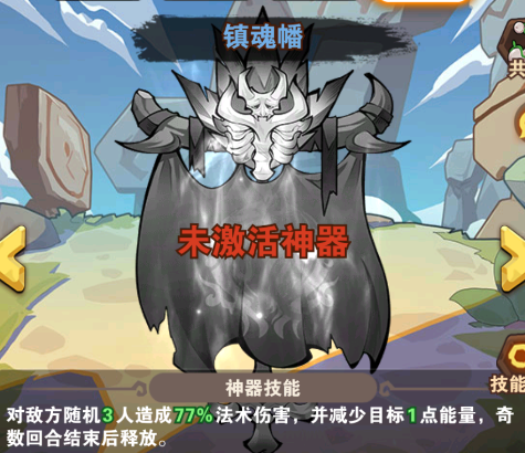 镇魂幡:对敌方随机3人造成77%法术伤害,并减少目标1点能量奇数回合结束后释放。
