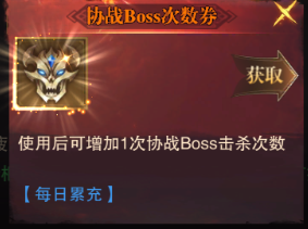 BOSS疲劳:可以通过消耗协战BOSS次数券来恢复疲劳。当前只能通过每日累充来获取。获取途径比较有限,但建议每天都拿到。