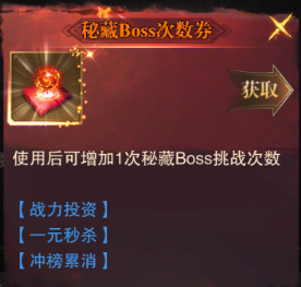 秘藏BOSS次数券来增加挑战的次数。秘藏BOSS券获得的途径比较多,主要有: