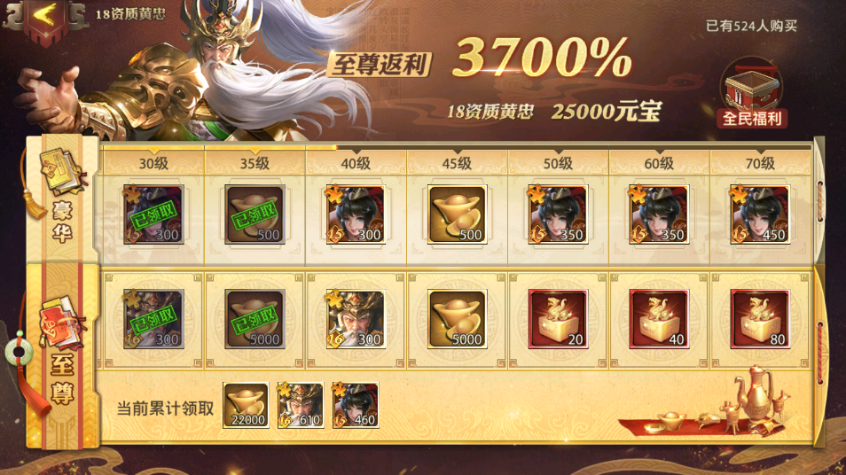 后排英雄玩家可以通过游戏内免费赠送的高级求贤令抽去16资质武将去补齐后排缺失的输出。这边推荐玩家可以购买6星黄忠获得获得16资质黄忠,玩家购买后通过16资质黄忠活动可以获得弓神印,在晋升台可以将黄忠晋升为18资质红将黄忠。